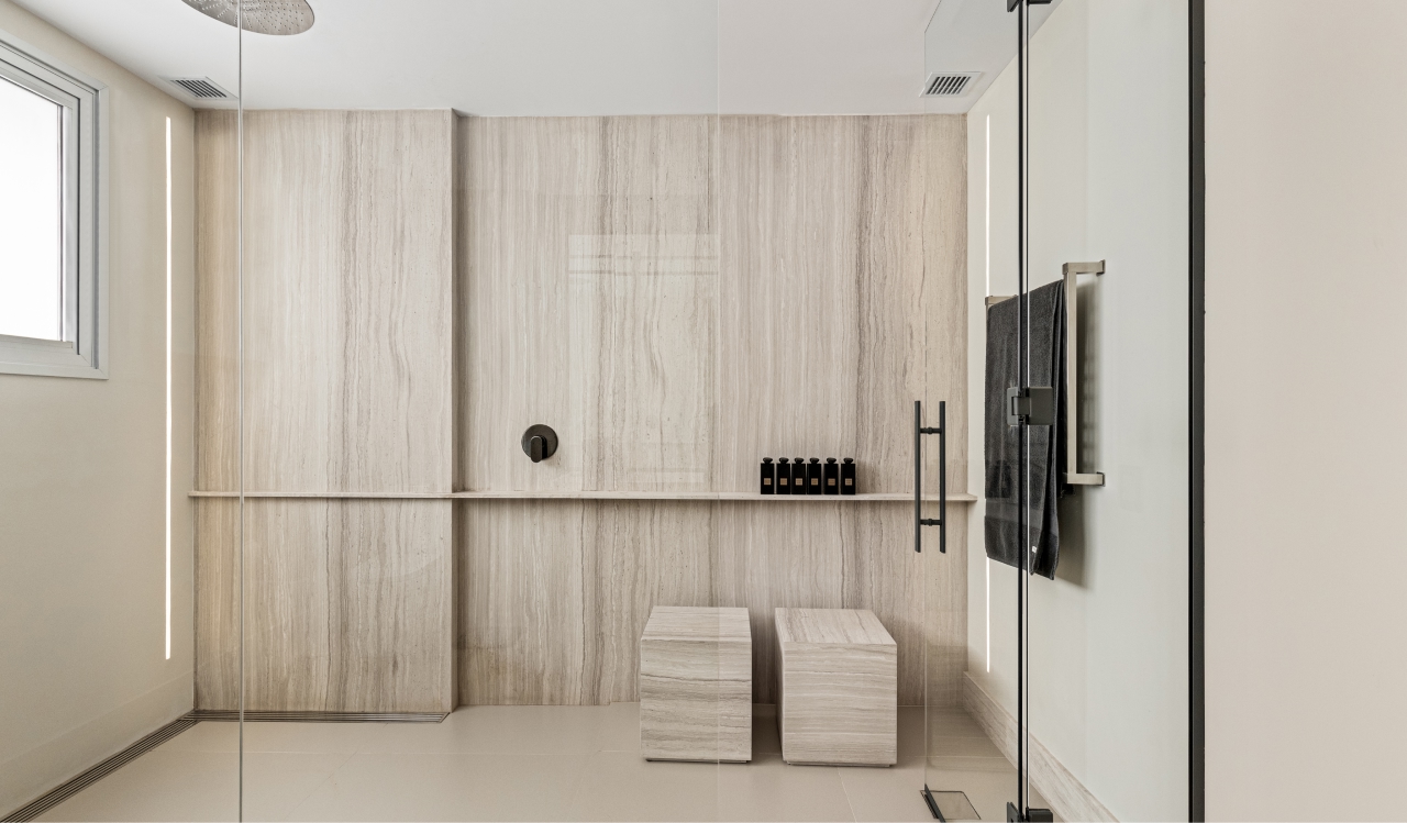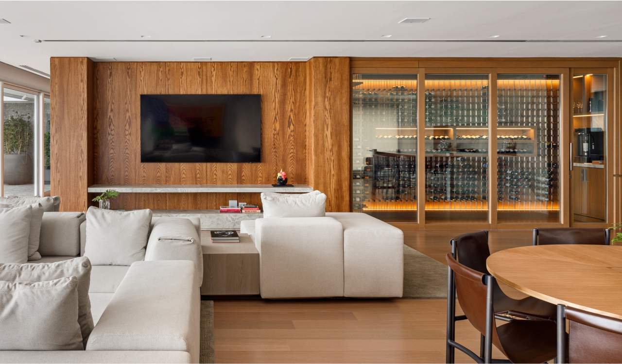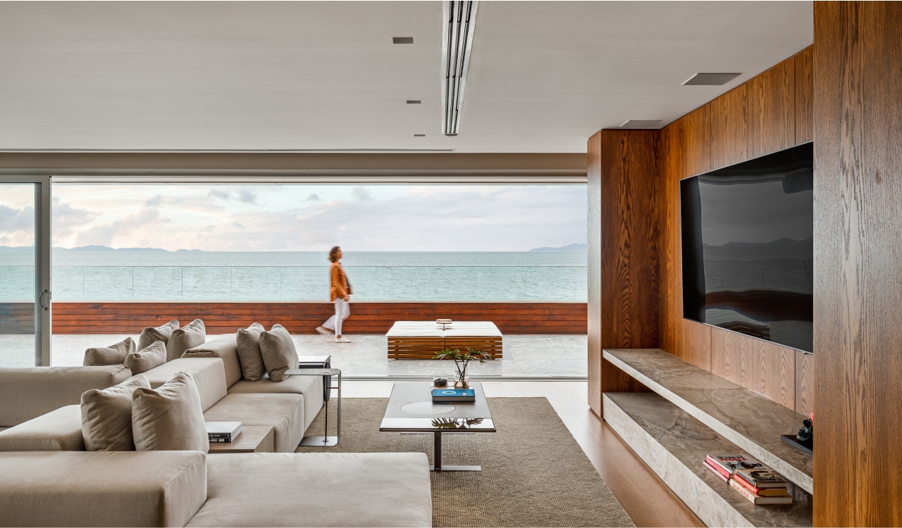 O mar protagoniza e determina o cenário. Na reconfiguração desta cobertura, os espaços sociais foram voltados para ele, valorizando o deslumbrante visual. Prioridade para o cliente, a amplitude é ponto forte neste projeto, resultado da reformulação total do layout do apartamento. A nova configuração privilegiou funcionalidade e fluidez e a equilibrada seleção de materiais e acabamentos garantiu o conforto e a harmonia visual. A madeira predomina, como uma estratégia para proporcionar sensação de acolhimento nos amplos espaços.