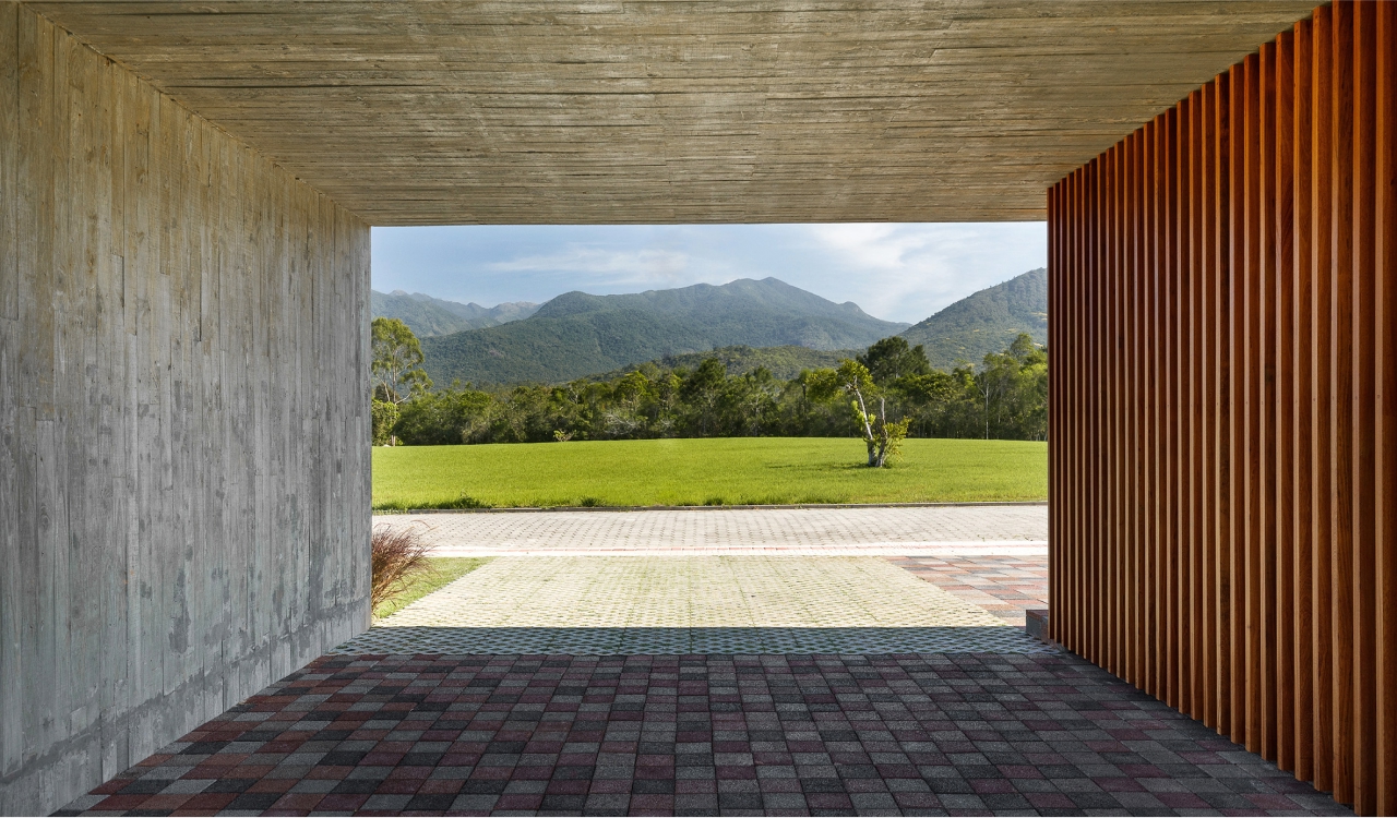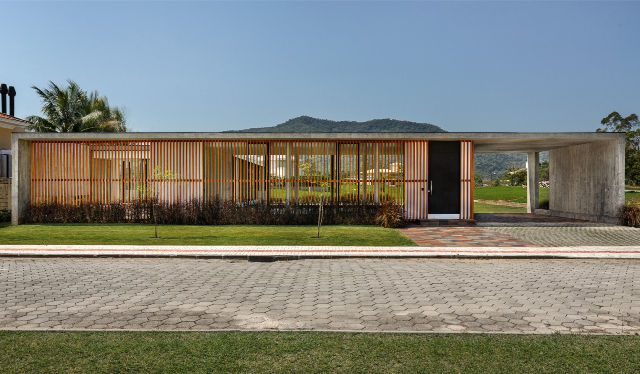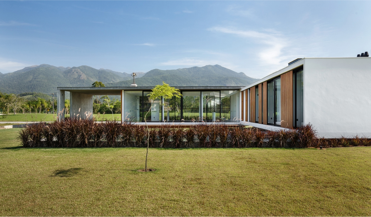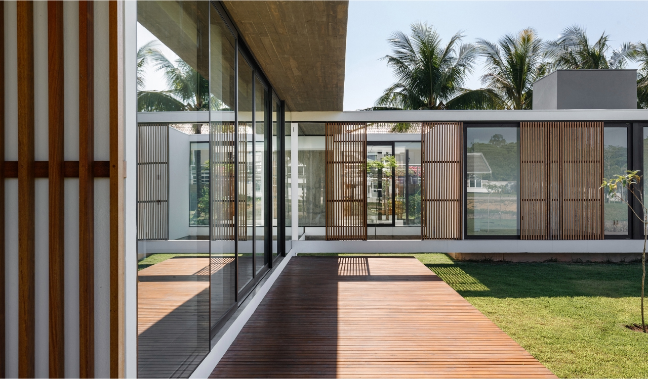 Simples de entender, mas sofisticada na execução, residência contemporânea tem referência na arquitetura internacional. A simplicidade sofisticada é evidente. A casa apresenta linhas limpas e uma linguagem clara, com ambientes internos amplamente conectados com os espaços externos. O layout reflete a atenção do projeto à orientação solar e pensamento ambiental. As áreas comuns, como salas e cozinha, formam um espaço integrado, semelhante a uma grande varanda coberta, que se abre para um pátio externo com um deck e piscina.