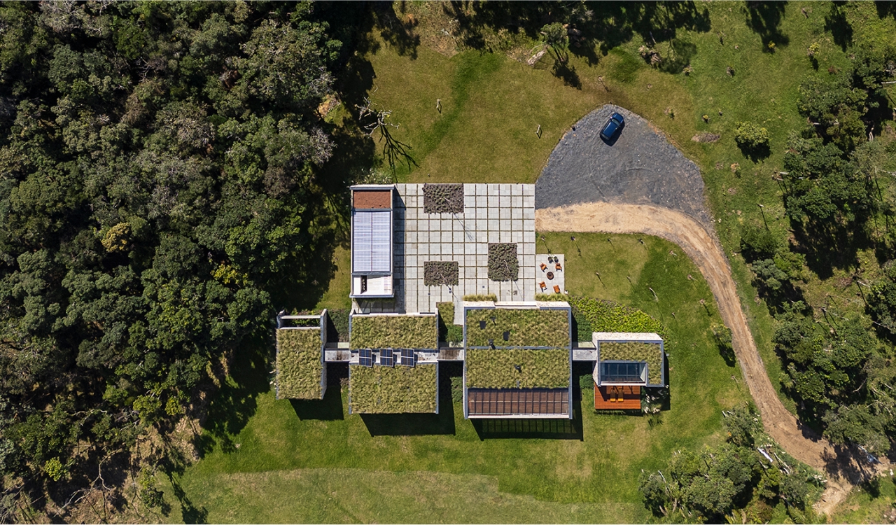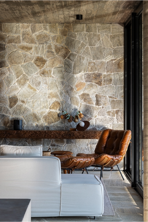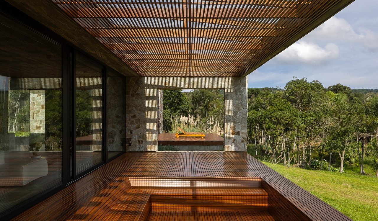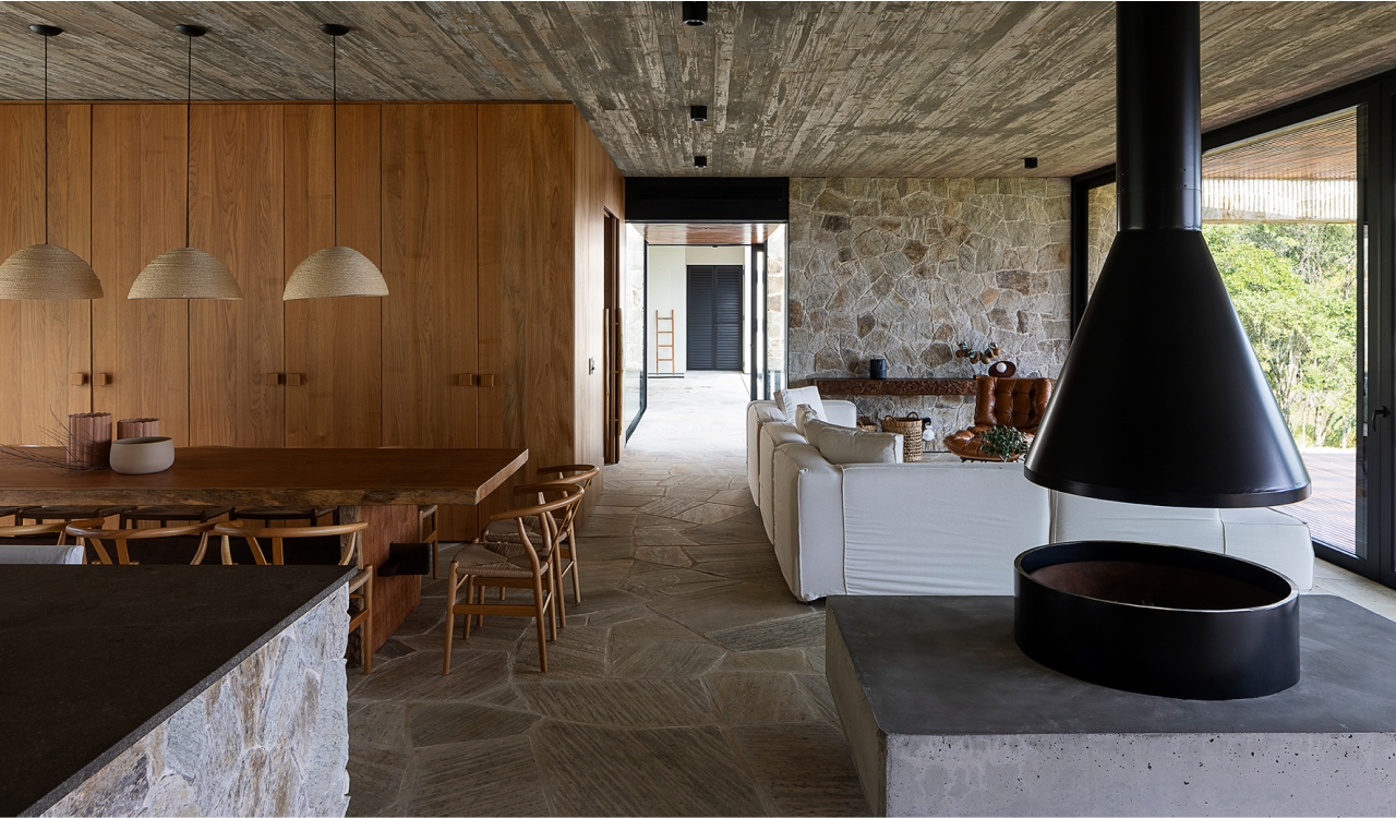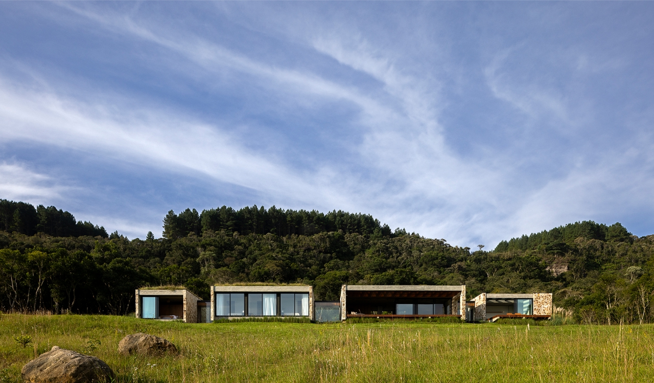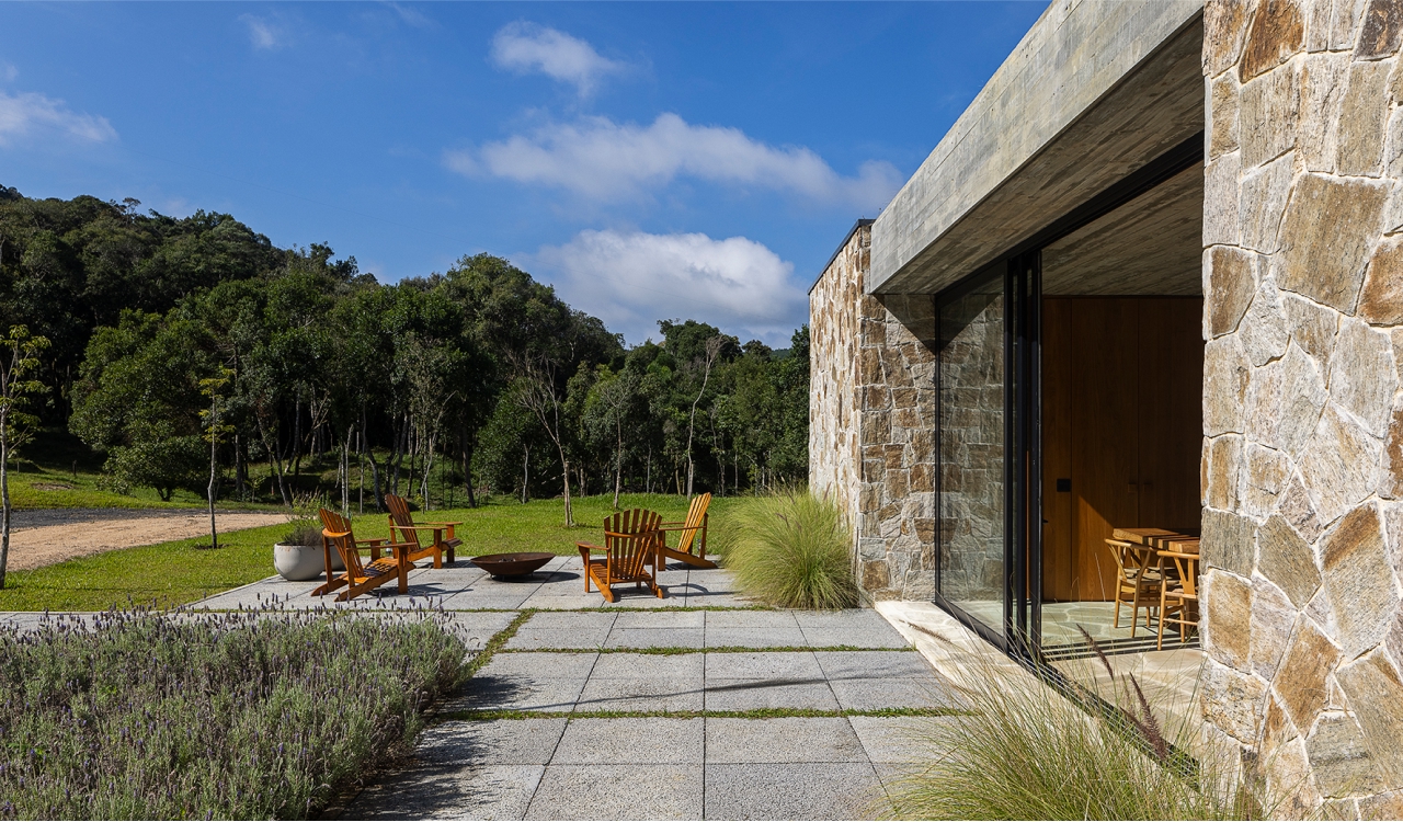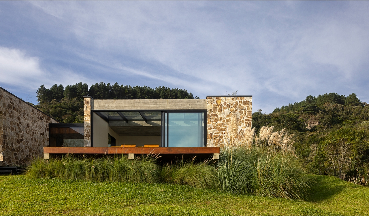 Implantada em uma grande área de fazenda, a casa associa o rústico ao contemporâneo e oferece uma experiência única de viver em meio à natureza. No planejamento, foi necessário ampliar as escalas. Um masterplan teve de ser desenvolvido em função da abrangência do programa arquitetônico, com diversas edificações. A localização da casa principal foi determinada pelo equilíbrio entre garantir vistas espetaculares, mas também acessibilidade e funcionalidade. Corredores envidraçados garante conexão visual permanente com a natureza exuberante.
