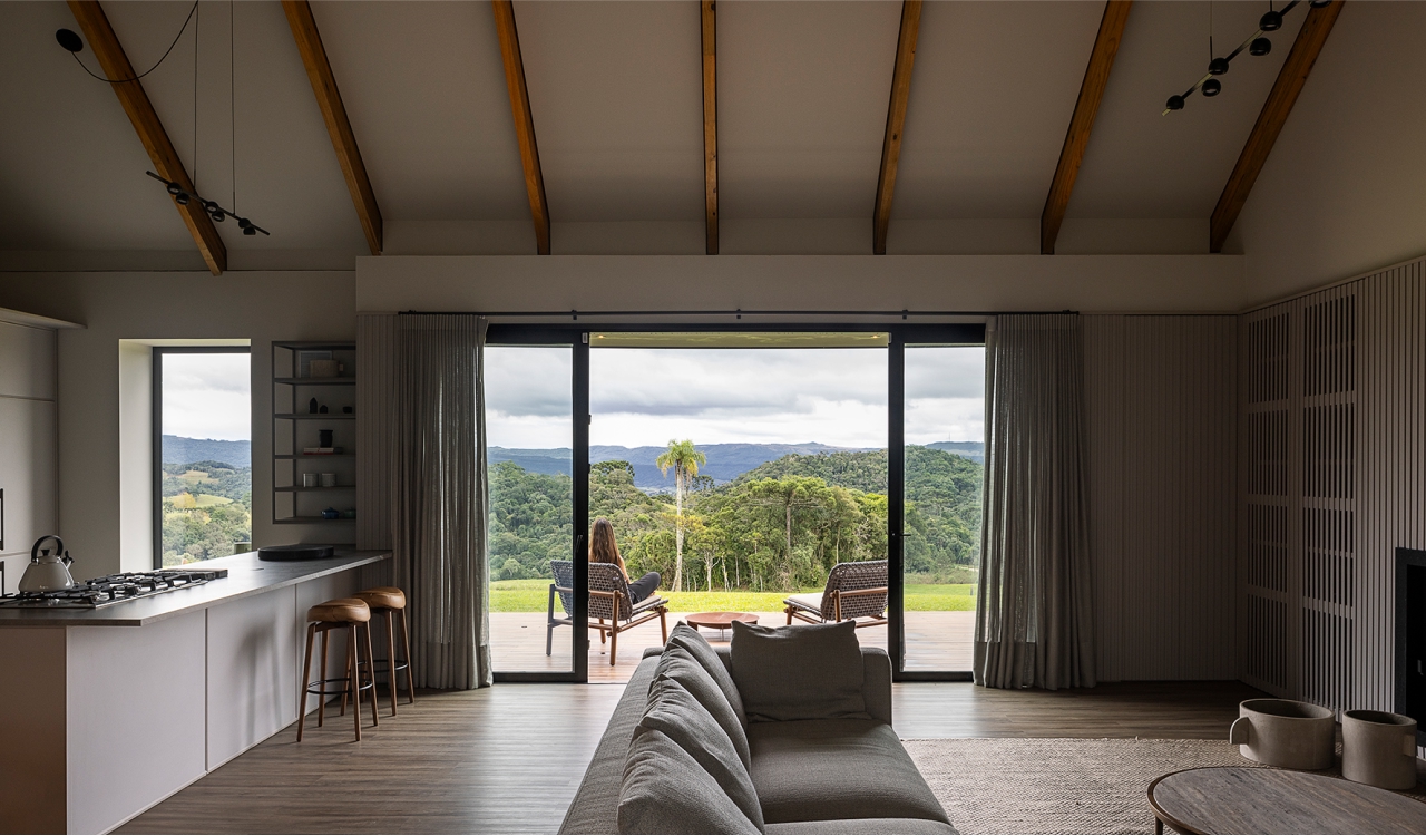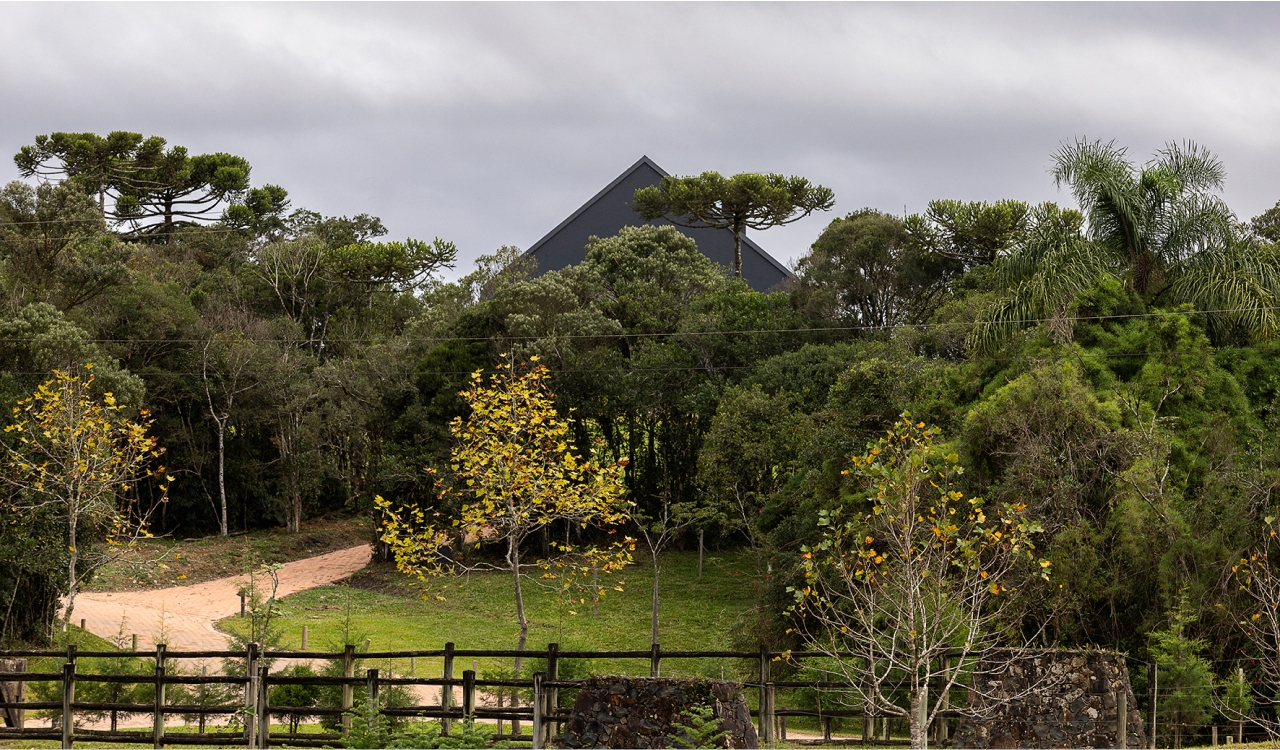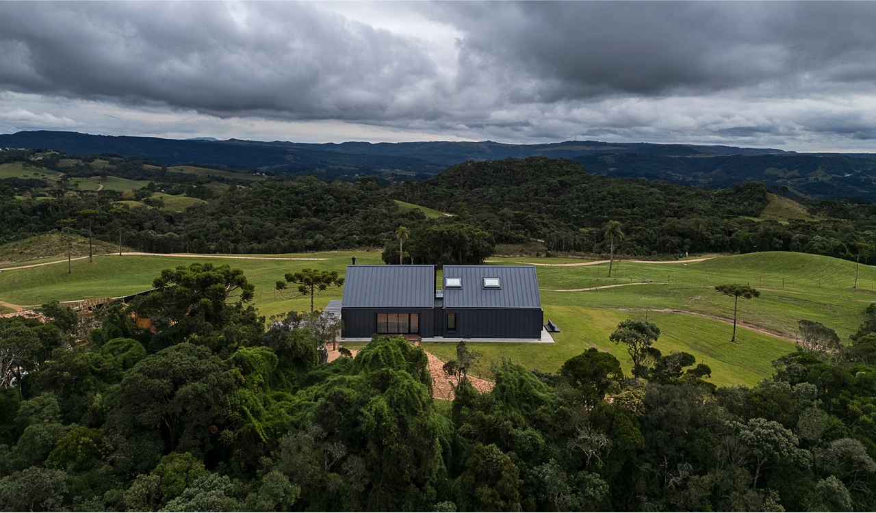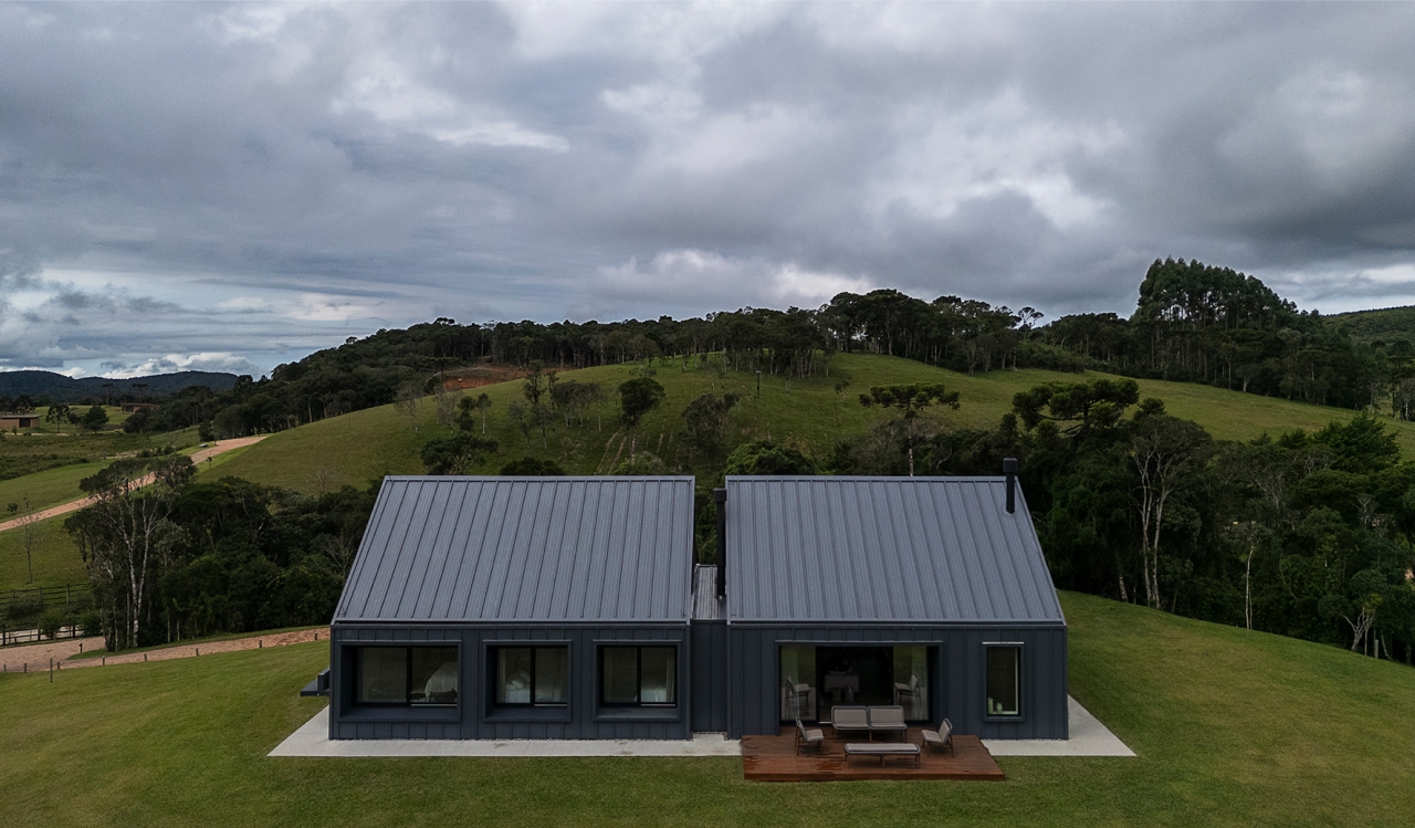 Arquitetura e natureza em harmonia. O projeto da casa de campo foi desenvolvido com a intenção de criar uma forte conexão visual entre a edificação e o ambiente natural ao seu redor. Assim, o layout seguiu o princípio de não estabelecer uma definição clara de frente e fundos, permitindo que a casa ofereça vistas panorâmicas de todos os ângulos. A inspiração principal foi a estética dos bangalôs escandinavos, de design simples e funcional, com espaços internos elegantes, aconchegantes e totalmente conectados com a paisagem.