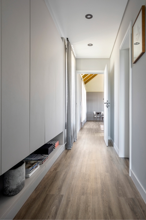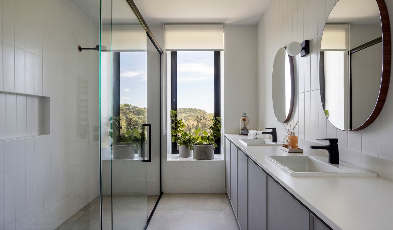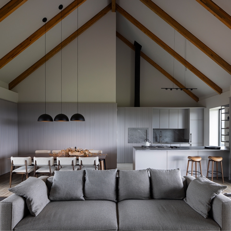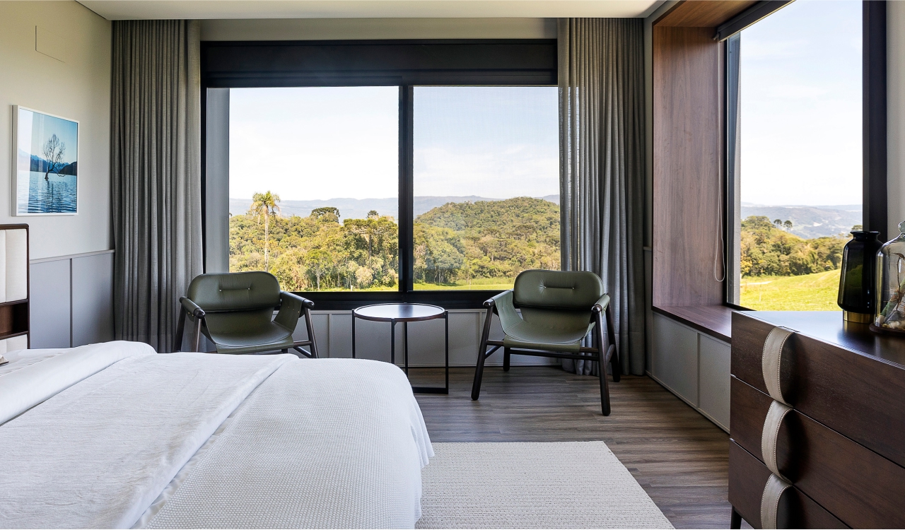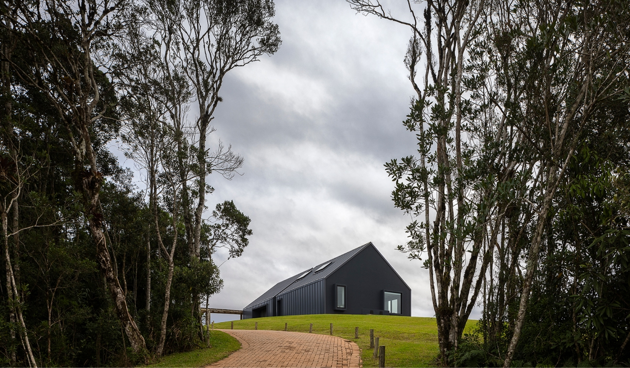 Arquitetura e natureza em harmonia. O projeto da casa de campo foi desenvolvido com a intenção de criar uma forte conexão visual entre a edificação e o ambiente natural ao seu redor. Assim, o layout seguiu o princípio de não estabelecer uma definição clara de frente e fundos, permitindo que a casa ofereça vistas panorâmicas de todos os ângulos. A inspiração principal foi a estética dos bangalôs escandinavos, de design simples e funcional, com espaços internos elegantes, aconchegantes e totalmente conectados com a paisagem.