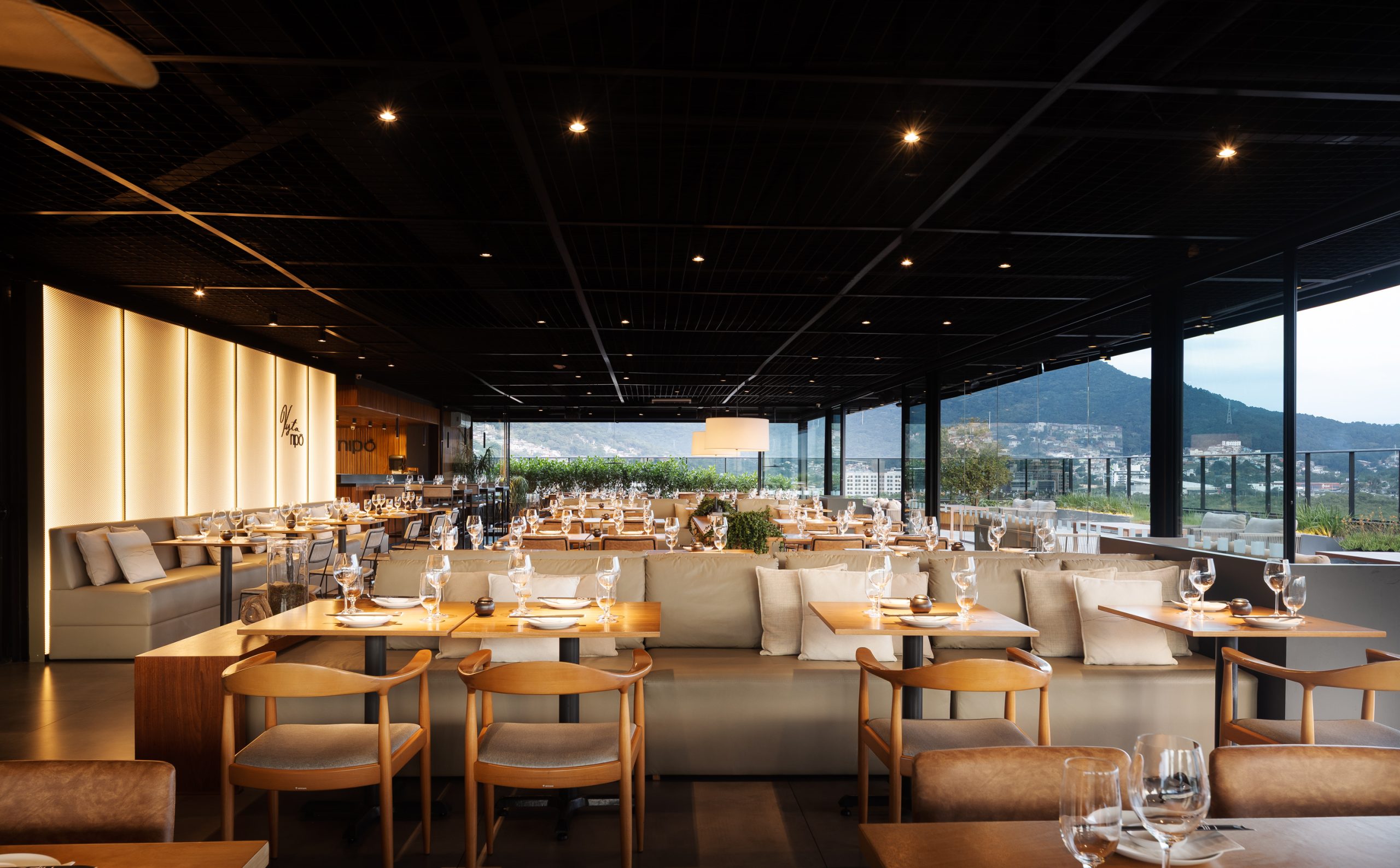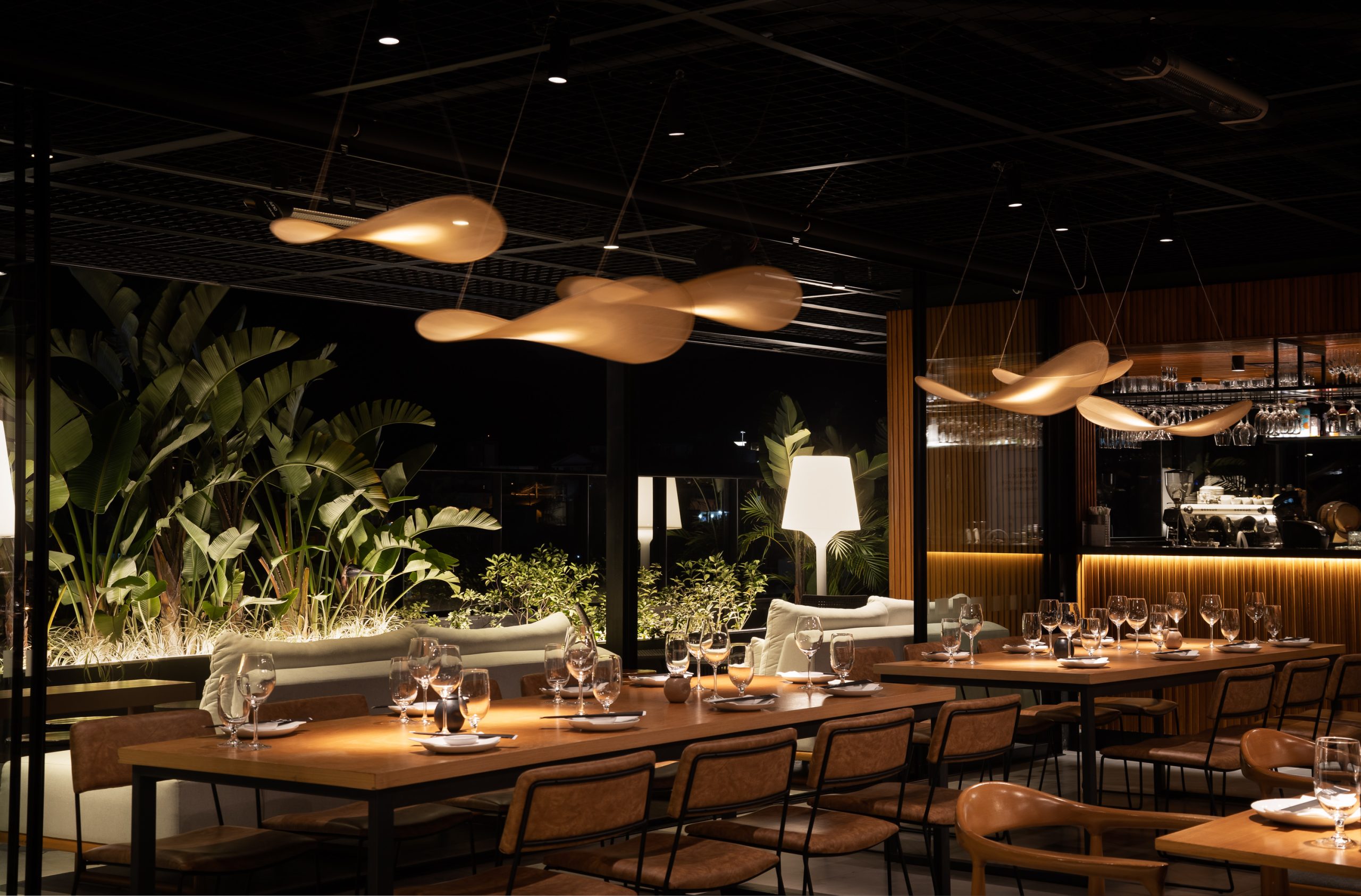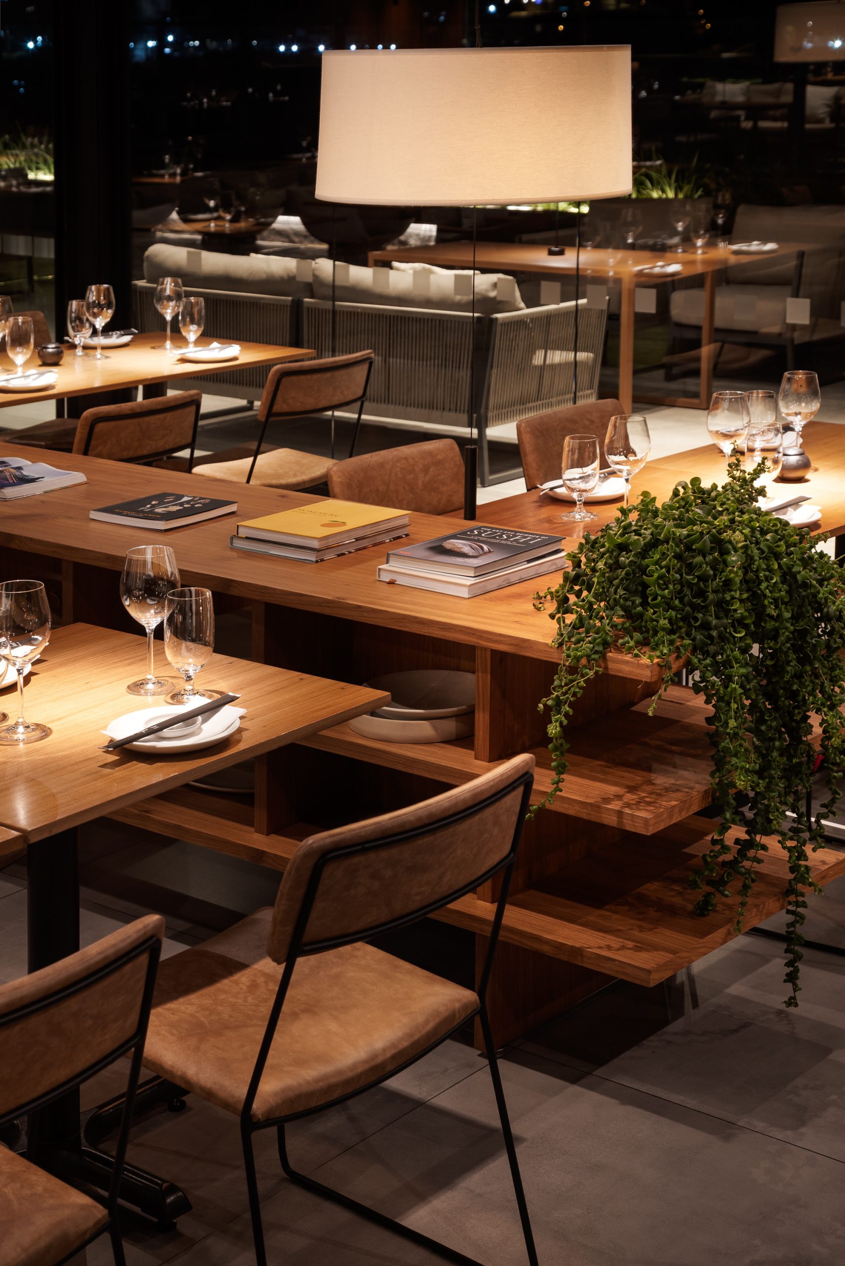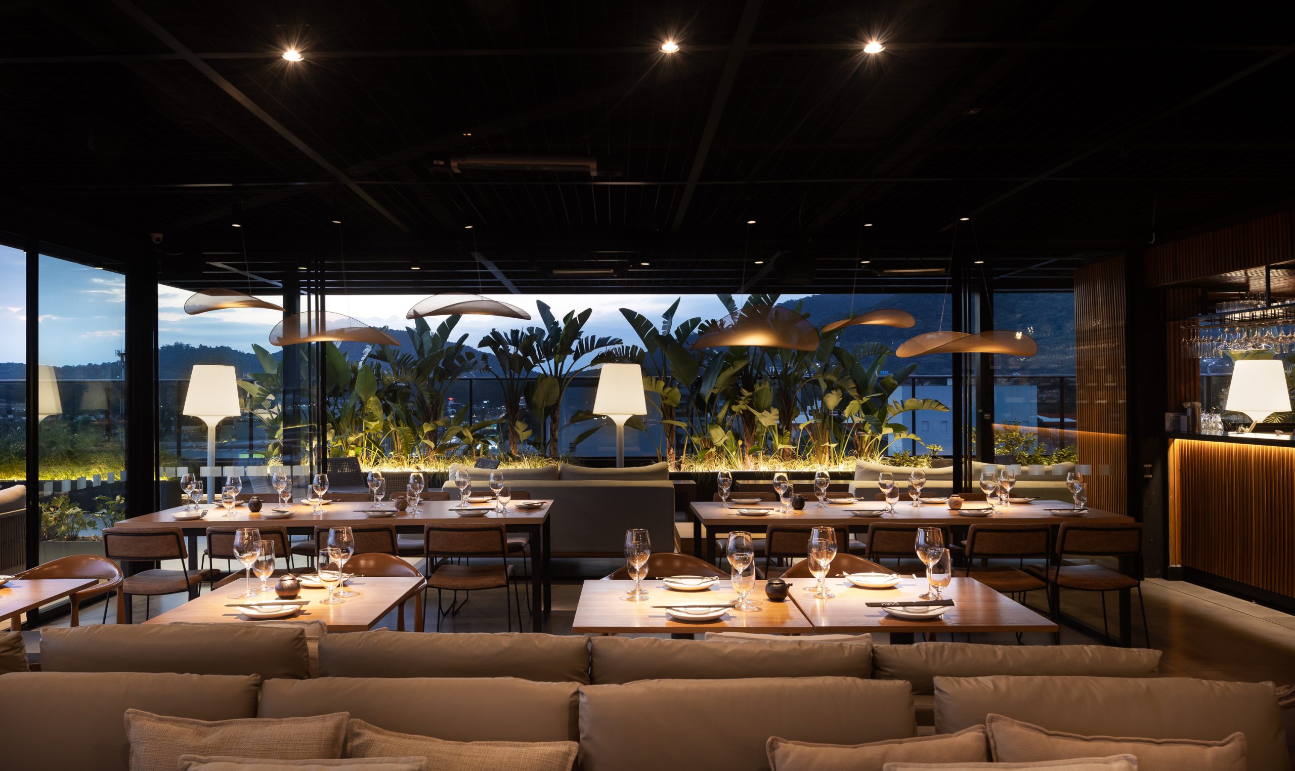 Inspirado na estética oriental e inserido no edifício Primavera Office, projetado pela Ark7, o restaurante foi concebido com foco na integração e na valorização da paisagem. Implantado em uma nave única, o espaço reúne diferentes configurações de mesas que permitem múltiplas possibilidades de ocupação e convivência. O rooftop amplia a experiência, oferecendo ao visitante uma vista panorâmica que caracteriza o local. A organização funcional distribui o bar e a recepção de um lado, e a cozinha com o sushibar no lado oposto, garantindo fluidez e eficiência. Materiais em tons neutros e iluminação intimista reforçam a atmosfera acolhedora e contemporânea do projeto.